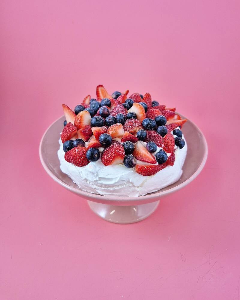 Schep een grote klodder van het slagroommengsel op de pavlova.